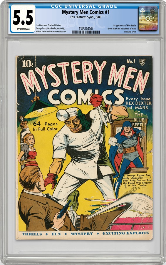 Included in this auction is a Mystery Men Comics #1 graded CGC 5.5 (lot 82070), published in August 1939, with the first appearance of the Blue Beetle (Dan Garret). Also offered is a Blue Beetle #1 graded CGC 4.0 (lot 82007), published in Winter 1939, which tells the origin of Blue Beetle in this debut issue of his first solo series. (The year 1939 was an innovative one for superheroes, as Superman launched in his own title and Batman debuted as well.)