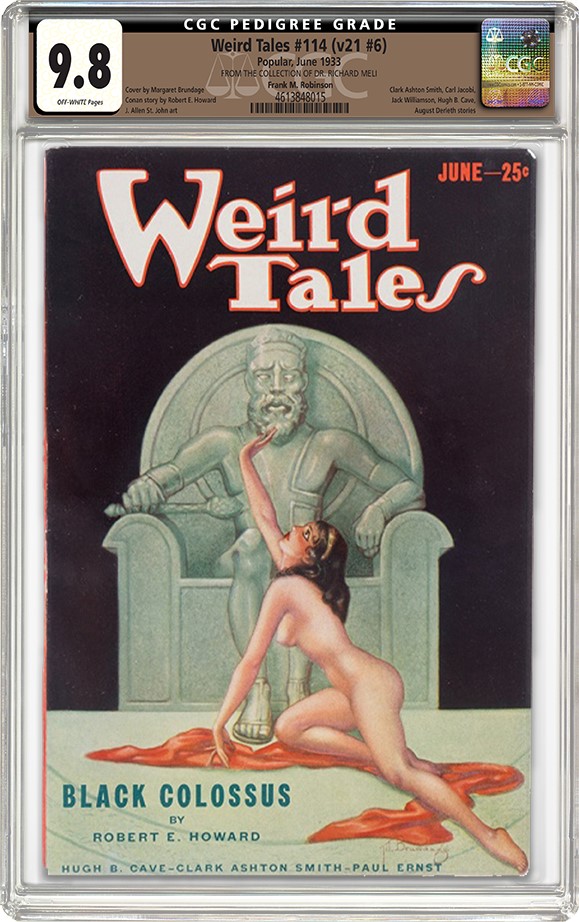 Fraze points to the June 1933 issue of Weird Tales, with its cover art by Margaret Brundage illustrating the Robert E. Howard story “Black Colossus,” an early Conan the Cimmerian story. Meli’s copy earned a 9.8 grade from CGC, as close to a perfect grade as most modern comic books can achieve.