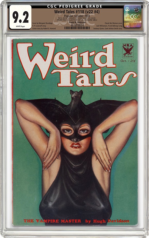 The Dr. Meli Collection boasts the entirety of Weird Tales’ original run from 1923 to 1954, including key issues like the first Conan story and the October 1933 No. 118 with its iconic Brundage “Bat Woman” cover painting. Dr. Meli’s copy is graded at 9.2 — the sole highest CGC-graded copy.