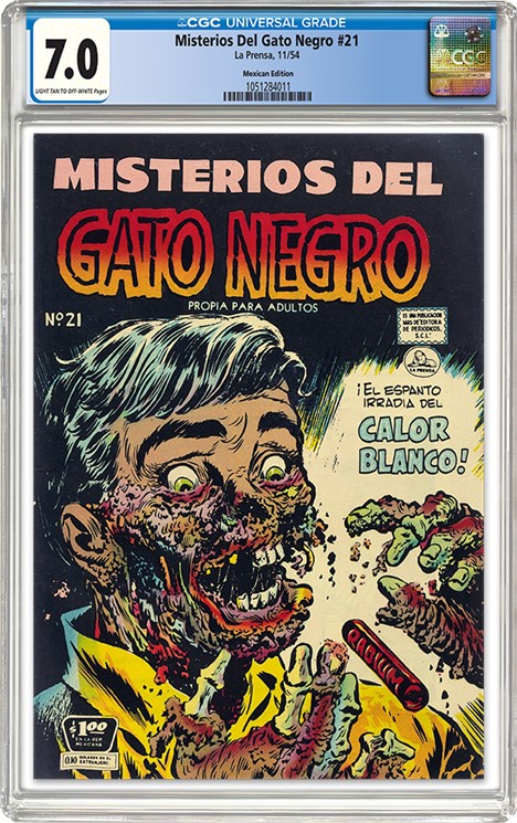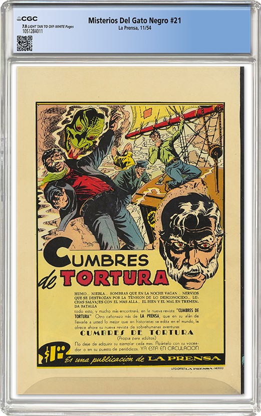 Featured in the Foreign Horror and Mystery Comics Showcase Auction on October 30, 2025, is a Misterios del Gato Negro #21 graded CGC 7.0 (lot 81079).