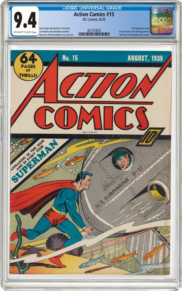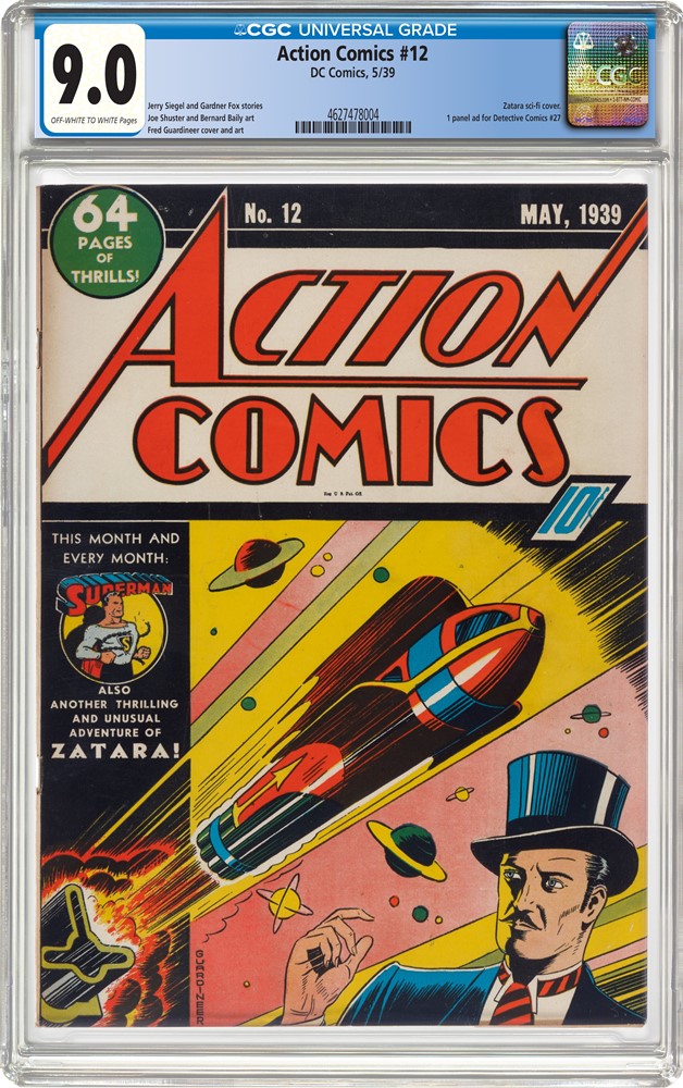 Along with this stunning copy of Superman #1, the family also discovered five early issues of Action Comics — #9 (CGC 6.5), #12 (CGC 9.0), #15 (CGC 9.4), #18 (CGC 9.0) and #21 (CGC 8.0). Three of these are unsurpassed in grade in the CGC Census.