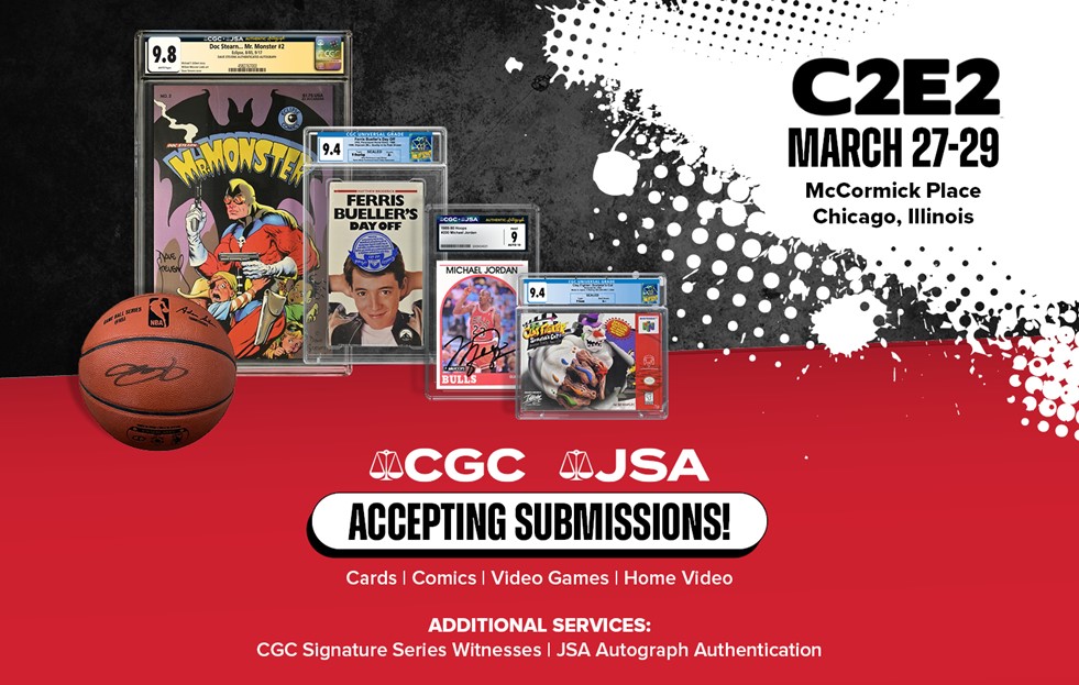 CGC® and JSA® are excited to offer on-site comic book grading and autograph authentication at Chicago Comic & Entertainment Expo (C2E2) at McCormick Place in Chicago, Illinois, on March 27-29, 2026. Collectors and dealers can also drop off regular submissions of comics, magazines, pulps, cards, video games, home video collectibles and autographed memorabilia, plus CGC Signature Series witnesses will be available for signings at the show.