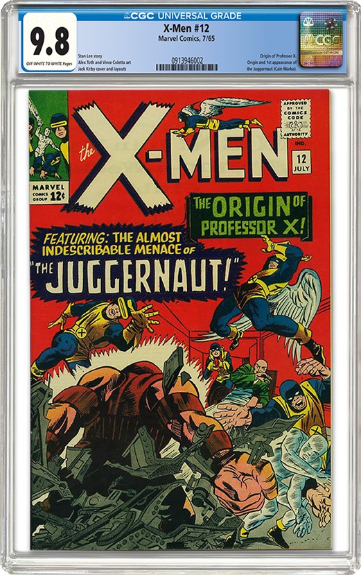 Also available is an X-Men #12 graded CGC 9.8. Featuring the first full appearance of the unstoppable Juggernaut, this comic — written by Stan Lee with art by Jack Kirby — revealed that Cain Marko was the abusive stepbrother of Professor Charles Xavier, whose power stemmed from the mystical Crimson Gem of Cyttorak rather than mutation.
