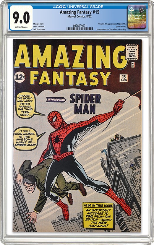 Leading the auction is an Amazing Fantasy #15 graded CGC 9.0 (lot 120), with an estimate of $400,000 to $600,000. This Silver Age grail features the first appearance of Spider-Man. Stan Lee came up with the idea of Spider-Man because he wanted a teen hero who was more than a sidekick. After initially rejecting it, Marvel later agreed to let him print the story in this final issue of Amazing Fantasy. Lee developed the issue with artist Steve Ditko, and Jack Kirby provided the cover. Sales went through the roof, and Marvel rushed him into his own series.