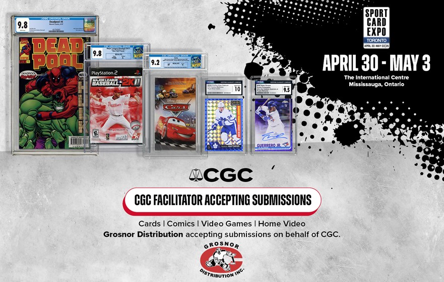 CGC® is excited to be accepting submissions of sports cards, TCGs, non-sports cards, comics, magazines, video games and home video collectibles through our Official Submission Center, Grosnor Distribution Inc., at Sport Card Expo Toronto, being held at The International Centre in Mississauga, Ontario, Canada, on April 30-May 3, 2026.