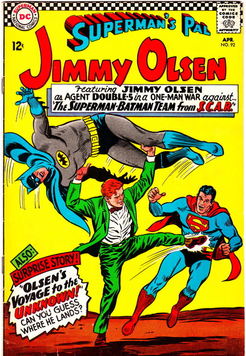 In Superman's Pal Jimmy Olsen #92 (April 1966), Jimmy battled “The Man from S.C.A.R.” The splash page shows a man in purple and orange standing in the middle of a blazing inferno with Superman, Supergirl, Lois Lane, Perry White, Batman and Jimmy Olsen all staring at him in shock. How the heck did Jimmy Olsen become the center of attention in a story with that many heroes? Batman? Supergirl? Superman? And the real conquering hero: Jimmy Olsen? This I have to see.