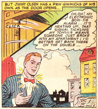 Fake Jimmy doesn't realize that “Jimmy Olsen has a few gimmicks of his own.” And I have to say, this is a gimmick that made me know this story was one I had to read. What is it? An electric bowtie alarm (because let's face it – everyone wears bowties. Men, women, children – you're not limiting your customer base at all by putting your high-tech alarm in a bowtie). Jimmy's electric bow tie alarm heats up, making Jimmy think, “That signal tickling my tonsils means someone just broke into my apartment!” It does make me wonder, where does one buy an electronic bowtie alarm? Even I'd wear bowties if I could have one of those. I suppose it could be one of his Superman souvenirs. Or maybe Jimmy was just lucky enough that the dude who made alarms was a big fan of bowties? Whatever the source (and we never learn who or what that source is), Jimmy goes running back to his apartment.