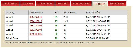 The History tab is visible only to the owner of a set. The tab provides a history of each action that occurred within a set and the change in points associated with the action. The addition of CGC books will display immediately on the History tab.