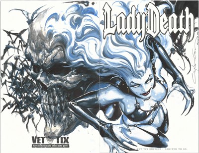 The Lady Death Artist Project Benefiting Vet Tix — Hero’s Wish will feature select artists’ portrayals of Lady Death in this limited-edition installment of the classic comic book. Popular artists such as Mark Brooks, Marc Silvestri, Whilce Portacio, Jay Anacleto, Humberto Ramos, Leinil Francis Yu, Frank Cho, Brandon Peterson, J. Scott Campbell, Clayton Crane, Phillip Tan and many others have been invited to participate in the anniversary collaboration. Once completed, the comic book covers will be scanned and posted for all to enjoy. The books will also be sent to CGC for Signature Series witnessed signature authentication prior to auctions.