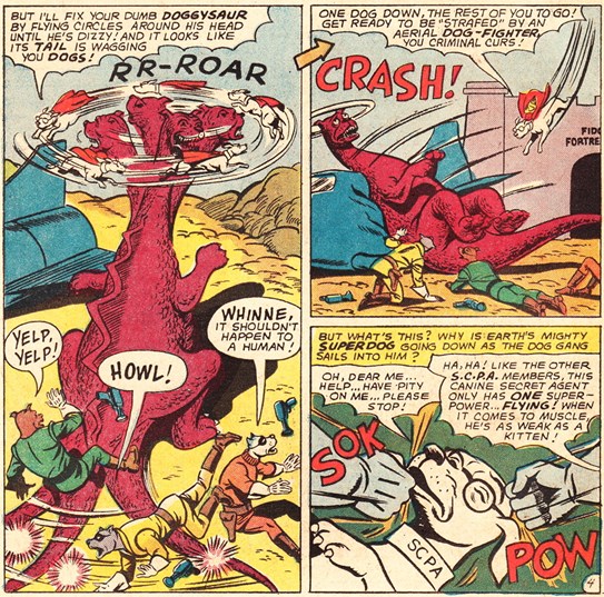With both the disguise and a new snazzy handle, Superboy's pet dog zooms overhead, dodging ray guns as he seeks out the criminal gang who has his canine compatriots. All is well until he runs into their watchdog, The Doggysaur! It is everything you are now thinking — i.e., a dinosaur with a dog head. That was what you are thinking, right?