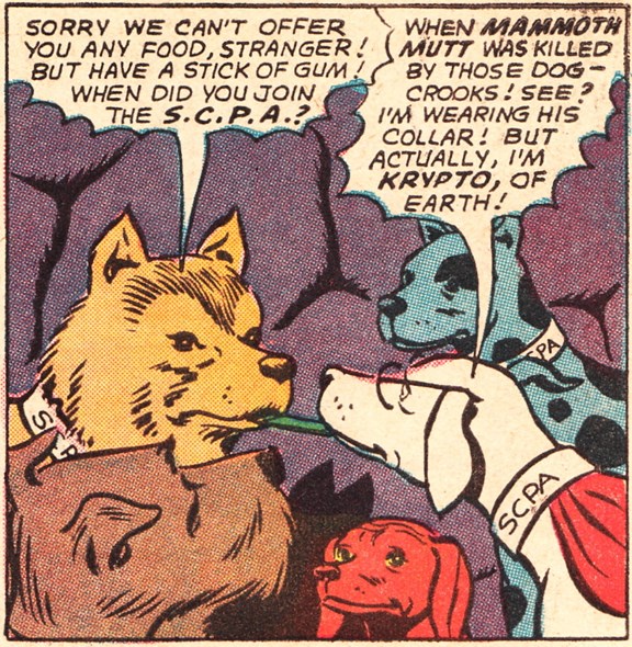 We find out it was Krypto's plan all along to have them throw him in with the other captured dogs. The dogs are delighted to see him, so much so that they give him a stick of gum. I had no idea that the giving of gum was something dogs did with each other. Apparently, because they were unable to offer him any food, they went with their second idea, the gifting of gum.