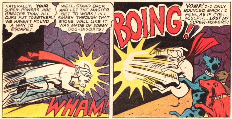 And now they're ready for a big display from Krypto, since his powers are the greatest of all. He begins his demonstration by ramming his head into a stone wall, expecting to smash through it "like it was made of soggy dog-biscuits!" Instead, he bounces off the wall with a giant "Boing!" Oh no! What's happened to Krypto? And why did he start his exhibition of powers by running into a brick wall? Dogs are so weird. Still, I sure hope Krypto is okay. But, what if he isn't?