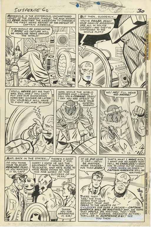 • Jack Kirby Fantastic Four #39 page featuring Doctor Doom as well as Wally Wood inked panels of Matt (Daredevil) Murdock; Finale page from the Captain America story in Tales of Suspense #60 featuring strong images of Cap and Baron Zemo