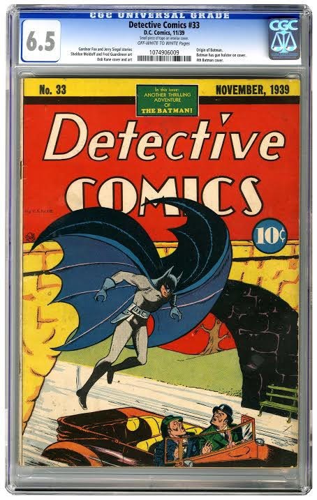 • Detective Comics #33 (1st Origin of Batman--1st time murder of Batman’s parents revealed and shown as the impetus behind Bruce Wayne becoming Batman, the 1st time Bruce Wayne is shown training himself to fight crime and the 1st time the bat is shown flying in through the window to inspire the Batman identity) CGC 6.5
