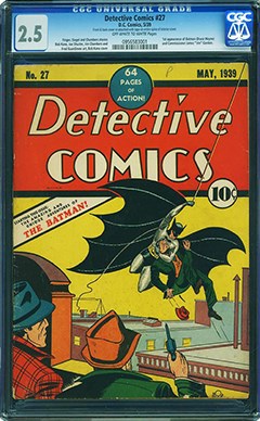 A Detective Comics #27 graded CGC 2.5 sold for $380,000 on Nov. 28 at a ComicLink auction. This 1939 comic book featuring the first appearance of Batman is widely considered to be one of the top two most coveted comics around.