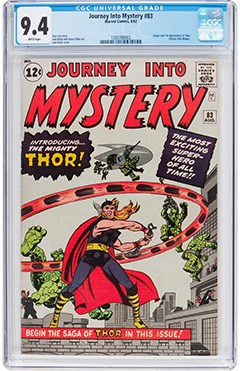 - Journey Into Mystery #83, graded CGC 9.4, sold for $191,200. This 1962 comic book features the first appearance of Thor.
