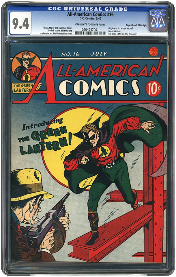 CGC has certified the Edgar Church (Mile High) copy of All-American #16. The comic has been graded CGC 9.4, making it the finest known example of the issue. Originally issued in July 1940, it features the first appearance and origin story of the Green Lantern. Of all the Golden Age key books, All-American #16 is considered to be the most difficult to locate in high grade.