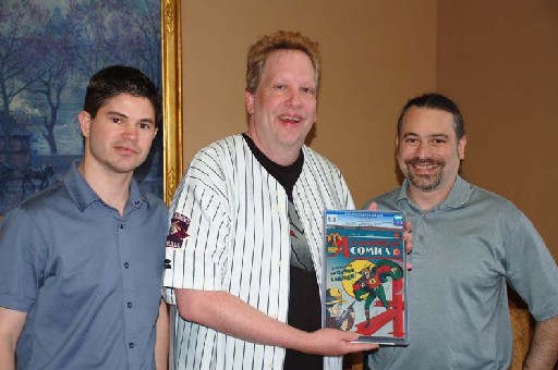 | Mark Haspel (left) and Steve Borock (right) surround John Verzyl as he proudly displays his newly certified comic. |